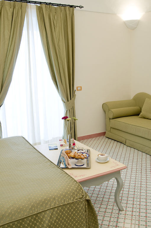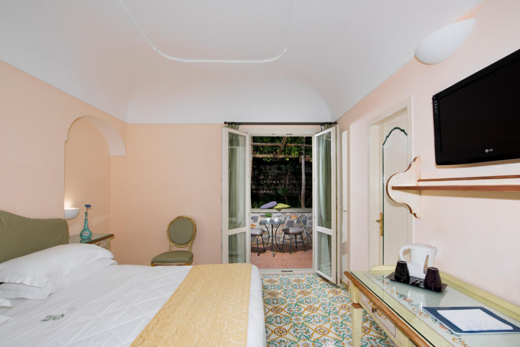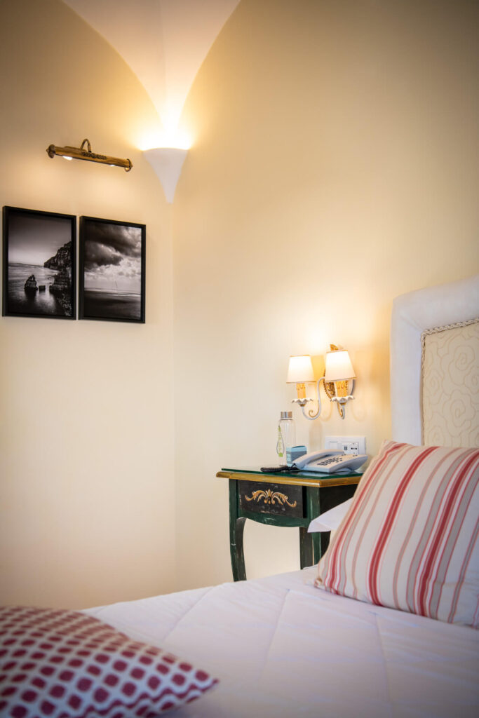 Spacious single rooms with large bed. Bright, furnished in typical Mediterranean hues with colorful tiles. Terrace with private garden overlooking the lemon grove. Equipped with all the modern comforts: air conditioning, Wi-Fi in the room, satellite tv with SKY channels, mini-bar, kettle with complimentary set, balconies soundproofed. Private bathroom with shower.